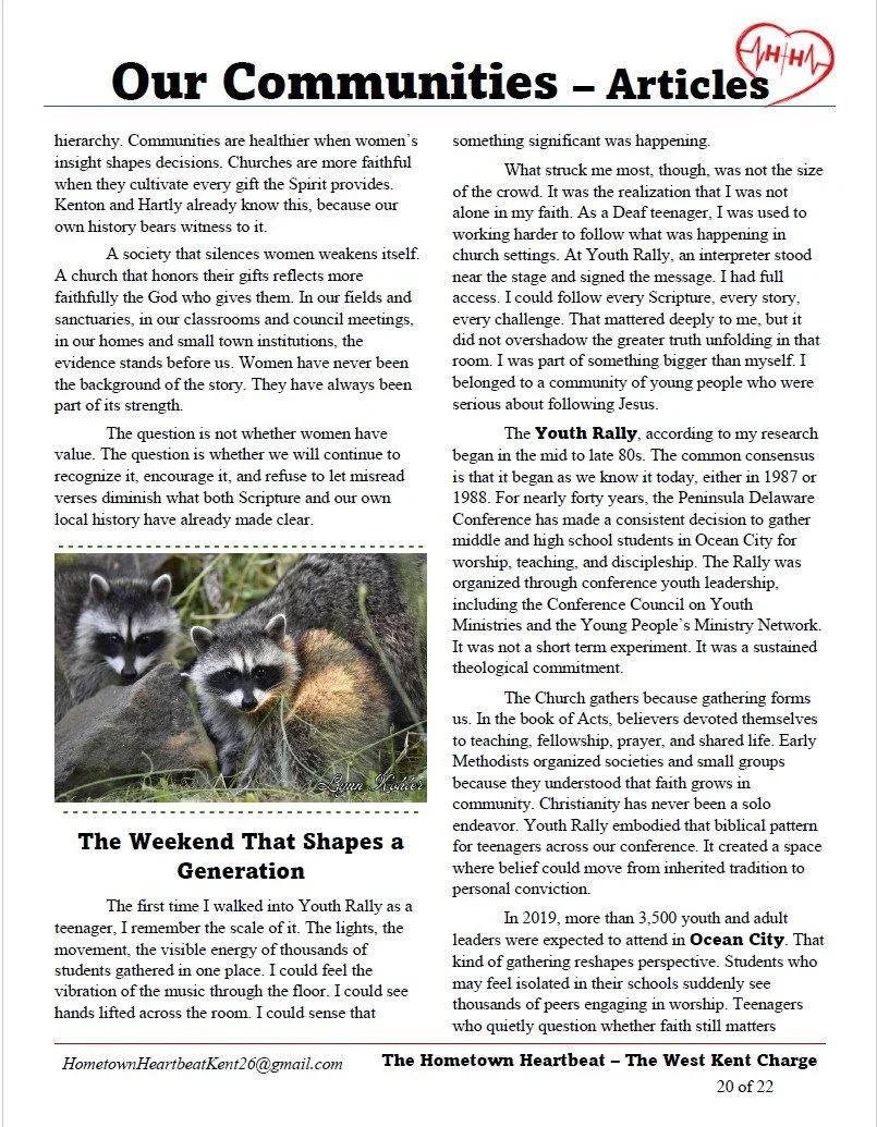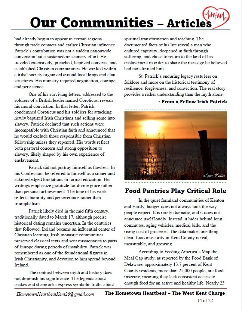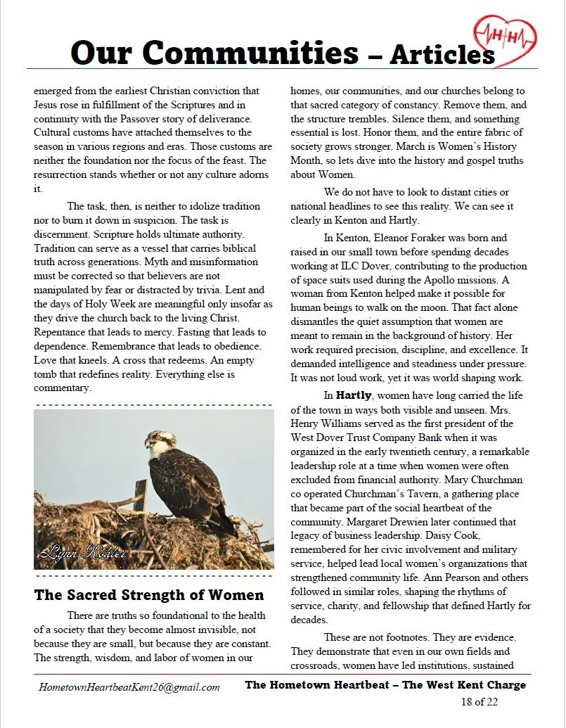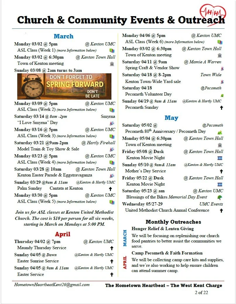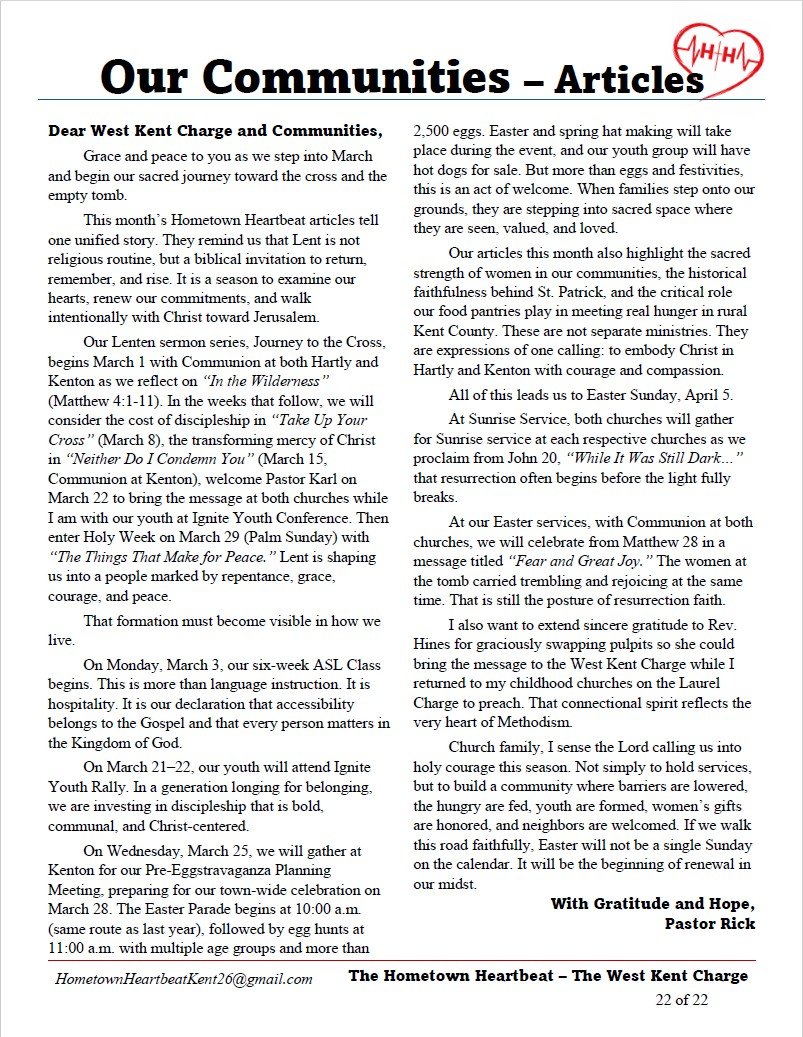 March 2026 Mar 6 Written By Kenton UMC www.facebook.com/KentonUMChurchwww.KentonUMC.orgwww.facebook.com/hartlyumc hvfc.hallrentals@gmail.comhttp://abeautifullifesanctuary.net/adoption-app/ www.statefireschool.delaware.govBreakfast at Rudy’s: A Cup of Joe, A Plate of Grief, Covered by a Generous Grace by Rebecca CollisonMoments for Mend And Mind by Dan Paddack HometownHeartbeatKent26@gmail.com Here is a downloadable version of March 2026 Newsletter:Newsprint Large Print Kenton UMC